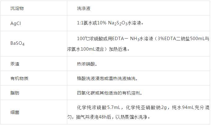 (2)針對(duì)不同的沉淀物采用適當(dāng)?shù)南礈靹┫热芙獬恋恚蚍磸?fù)用水抽洗沉淀物,再用蒸餾水沖洗干凈,在110℃烘箱中烘干,然后保存在無(wú)塵的柜內(nèi)或有蓋的容器內(nèi)。若不然積存的灰塵和沉淀堵塞濾孔很難洗凈。表2 列出一些洗滌砂芯濾板的洗滌液可供選用。