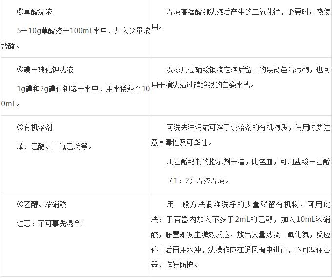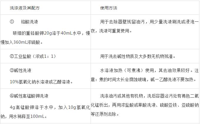 鉻酸洗液因毒性較大盡可能不用,近年來(lái)多以合成洗滌劑和有機(jī)溶劑來(lái)除去油污,但有時(shí)仍要用到鉻酸洗液,故也列入表內(nèi)。