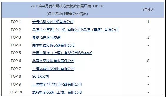 其中,只有3月榜單中的安捷倫、賽默飛、北京來亨3家公司繼續上榜,其余7家公司均淡出4月榜單。新上榜的7家公司中,4家國外儀器廠商,3家國內儀器廠商。