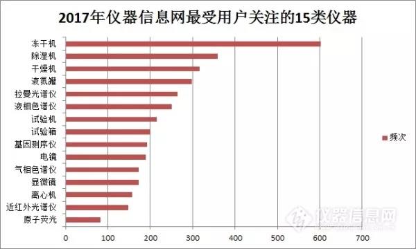 2017年,儀器信息網(wǎng)資訊欄目最受用戶關(guān)注的是凍干機、除濕機、干燥機、液氮罐、拉曼光譜儀等15個儀器類別,其中5類屬于實驗室常用設(shè)備,光譜儀3類,色譜儀、物性測試儀器、光學(xué)儀器各兩類。2017全年含“色譜”二字的關(guān)鍵詞共出現(xiàn)1007次,“光譜”出現(xiàn)877次,“質(zhì)譜”出現(xiàn)646次。