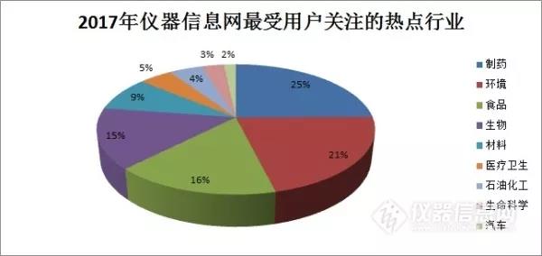 從數(shù)據(jù)可以看出,2017年儀器用戶關(guān)注的熱門領(lǐng)域仍在制藥、環(huán)境、食品三大行業(yè),這與儀器信息網(wǎng)行業(yè)應(yīng)用欄目解決方案的增長趨勢不謀而合。2017年,資訊欄目“制藥”關(guān)鍵詞出現(xiàn)2330次,“環(huán)境”出現(xiàn)2000次,“食品”出現(xiàn)1520次,其后分別是生物、材料、醫(yī)療衛(wèi)生和石油化工等。