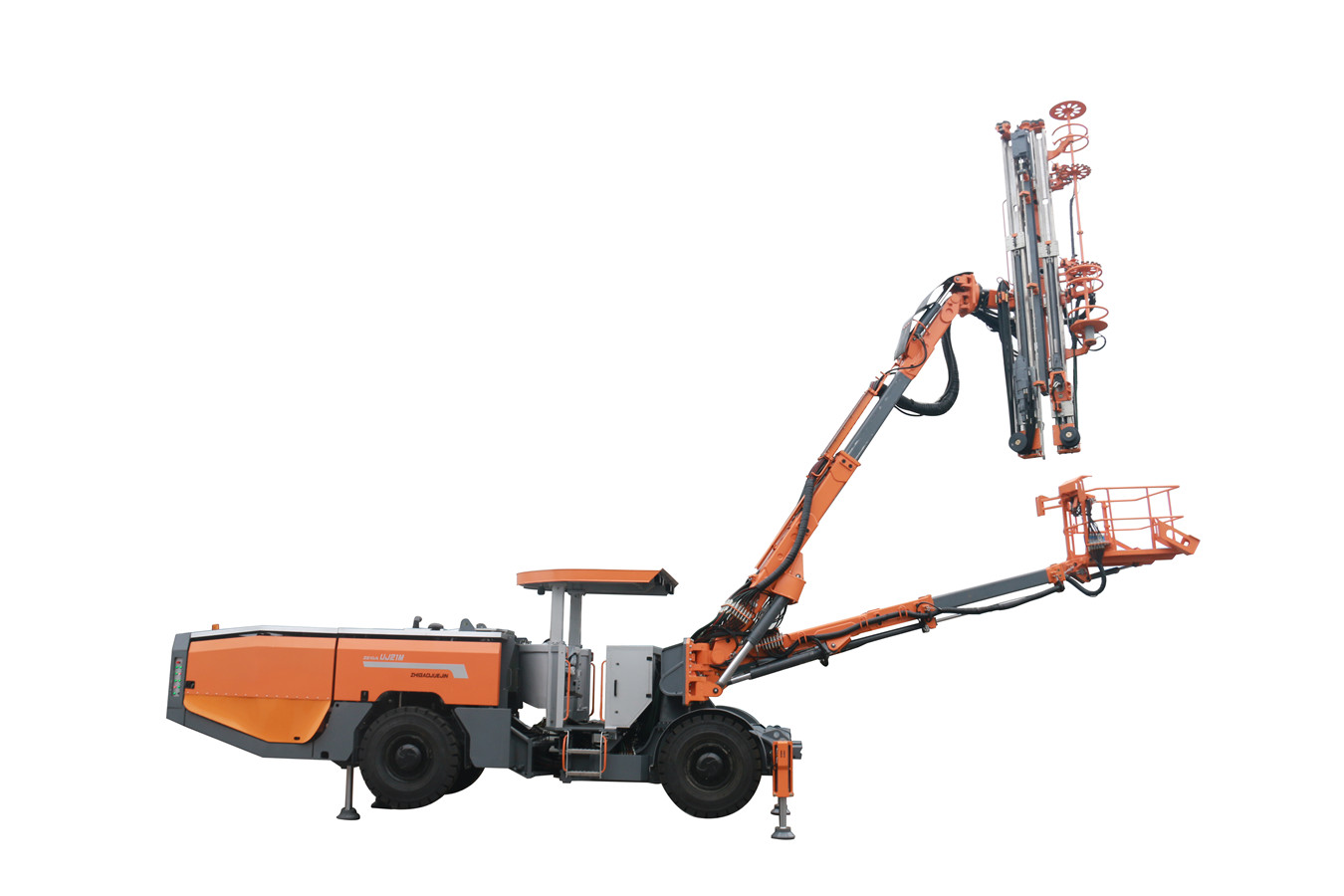 一臂一平臺設計,使此錨桿鉆機具備更多功能,除主工作臂實現鉆錨注一體化施工外,服務平臺可用于測量,補充錨桿、輔助安裝錨桿、注漿、撬毛等,一機多用。